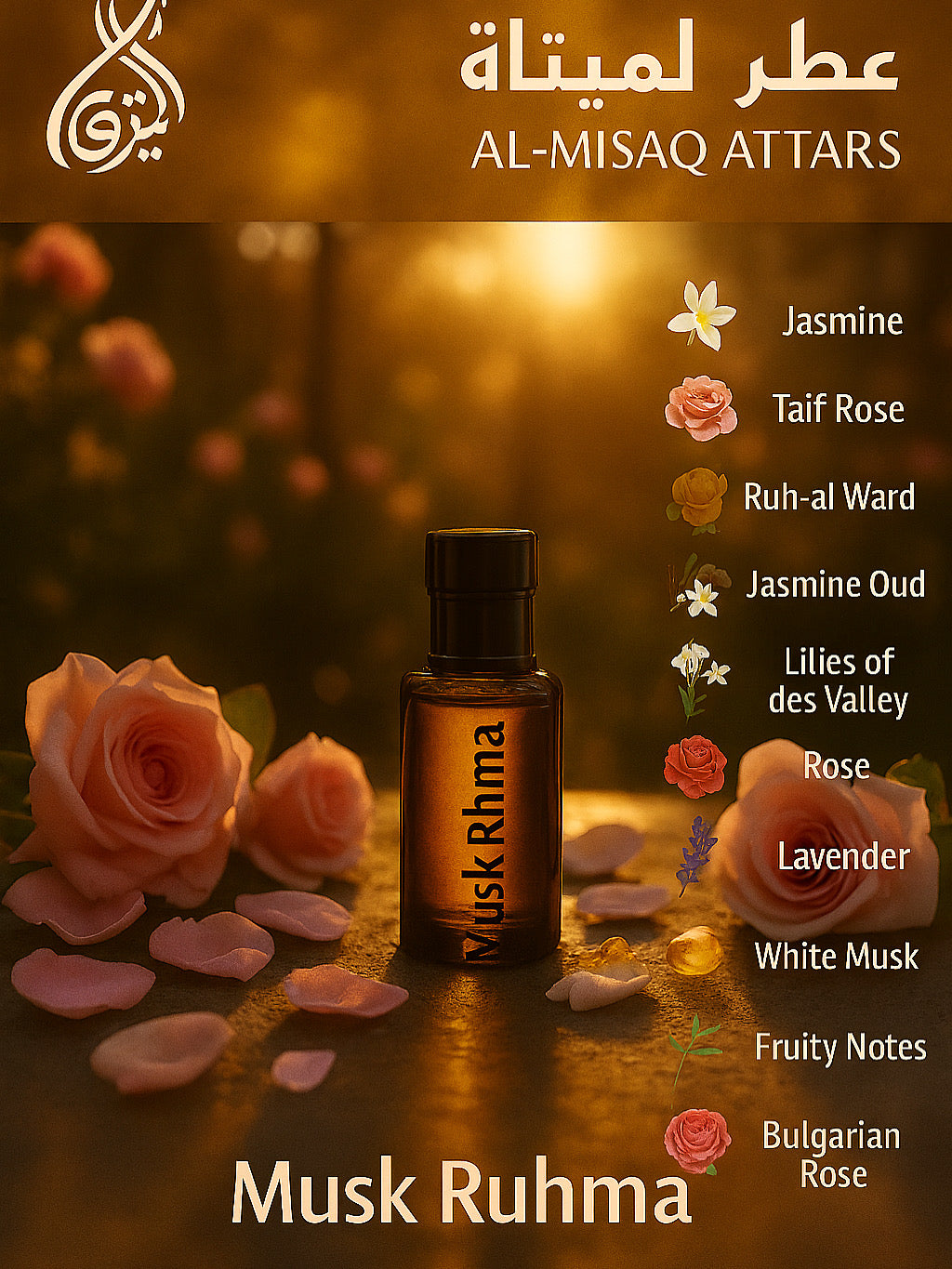 “A luxurious blend that begins with the elegance of Jasmine, Taif Rose, and Ruh-al Ward. It unfolds into a rich floral heart of Jasmine oud, lilies of the valley, rose, and lavender. The base lingers with warm amber, soft white musk, fruity undertones, and a touch of Bulgarian rose.”
